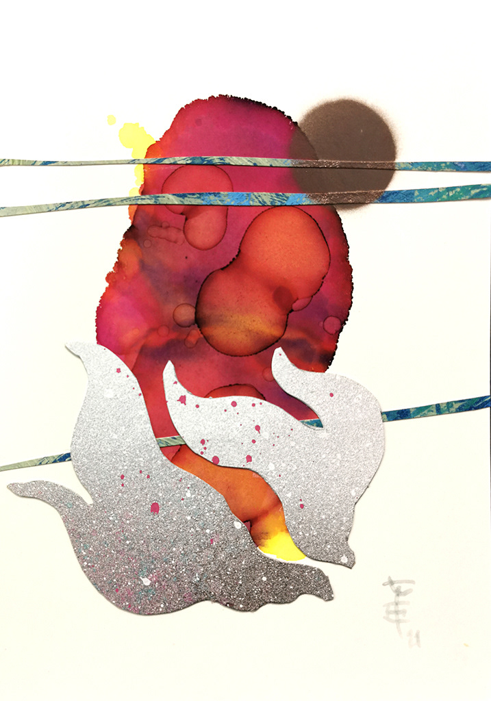 Do powstania ich użyłam tuszy alkoholowych, sprayu, różnego rodzaju farb złotych i srebrnych, akryli, brokatu, różnego rodzaju papierów w celu zróżnicowania wysokości i wykorzystania światłocienia.