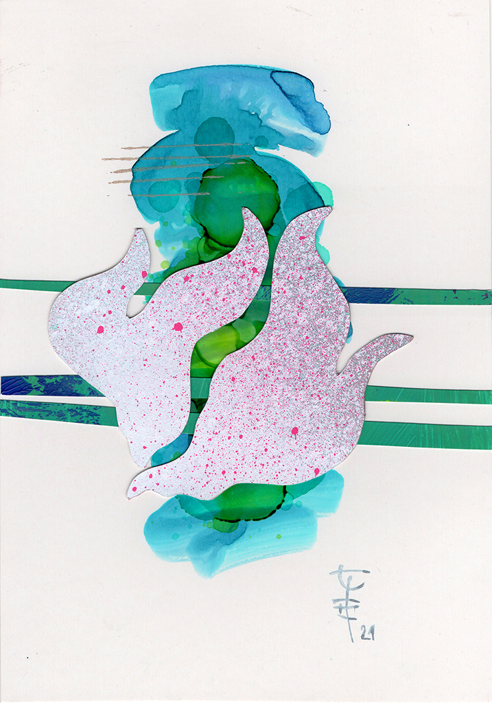 Od początku roku podejmuję próby zrobienia zdjęć, skanów moich eksperymentów, które stały się ostatecznie kolażami. Wciąż nie mogę uwiecznić tego co mnie w nich najbardziej fascynuje, a mianowicie, co dzieje się ze światłem. Na pracach są różne rodzaje srebra i złota, co sprawia, że wciąż się zmieniają. Zdjęcie je spłaszcza, odbiera tą wielowarstwowość.