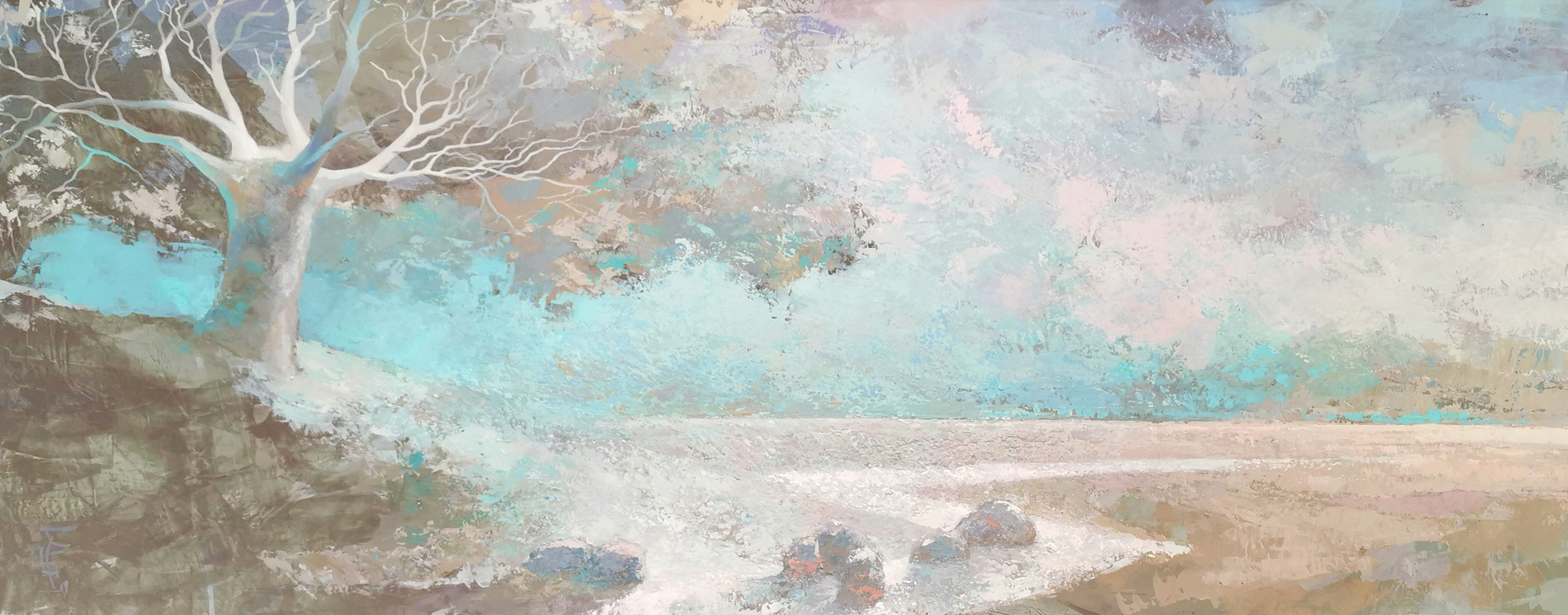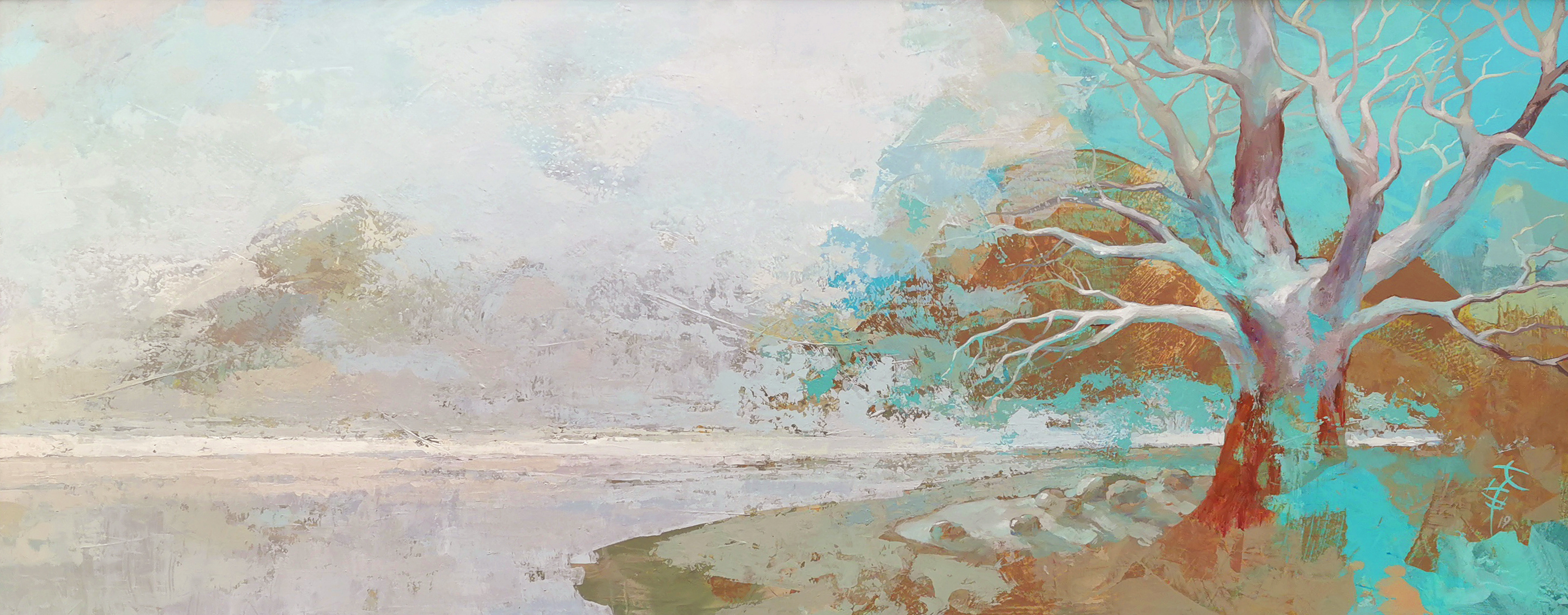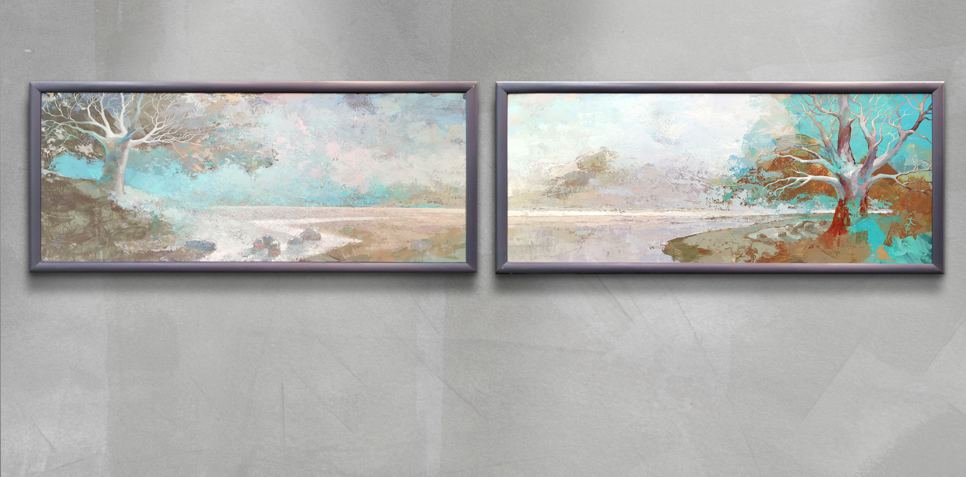 Dyptyk "Ona i On pod wspólnym niebem" to artystyczna opowieść o pozornej odrębności i głębokim połączeniu między dwojgiem istot. Na pierwszy rzut oka widzimy dwa oddzielne obrazy, każdy z nich przedstawia samotne drzewo. Jednak gdy przyjrzymy się uważniej, dostrzeżemy, że krajobraz płynnie się łączy, tworząc jedną nieprzerwaną przestrzeń. Woda, powietrze, ziemia — wszystkie elementy natury splatają się, symbolizując nierozerwalne więzi łączące nas wszystkich.