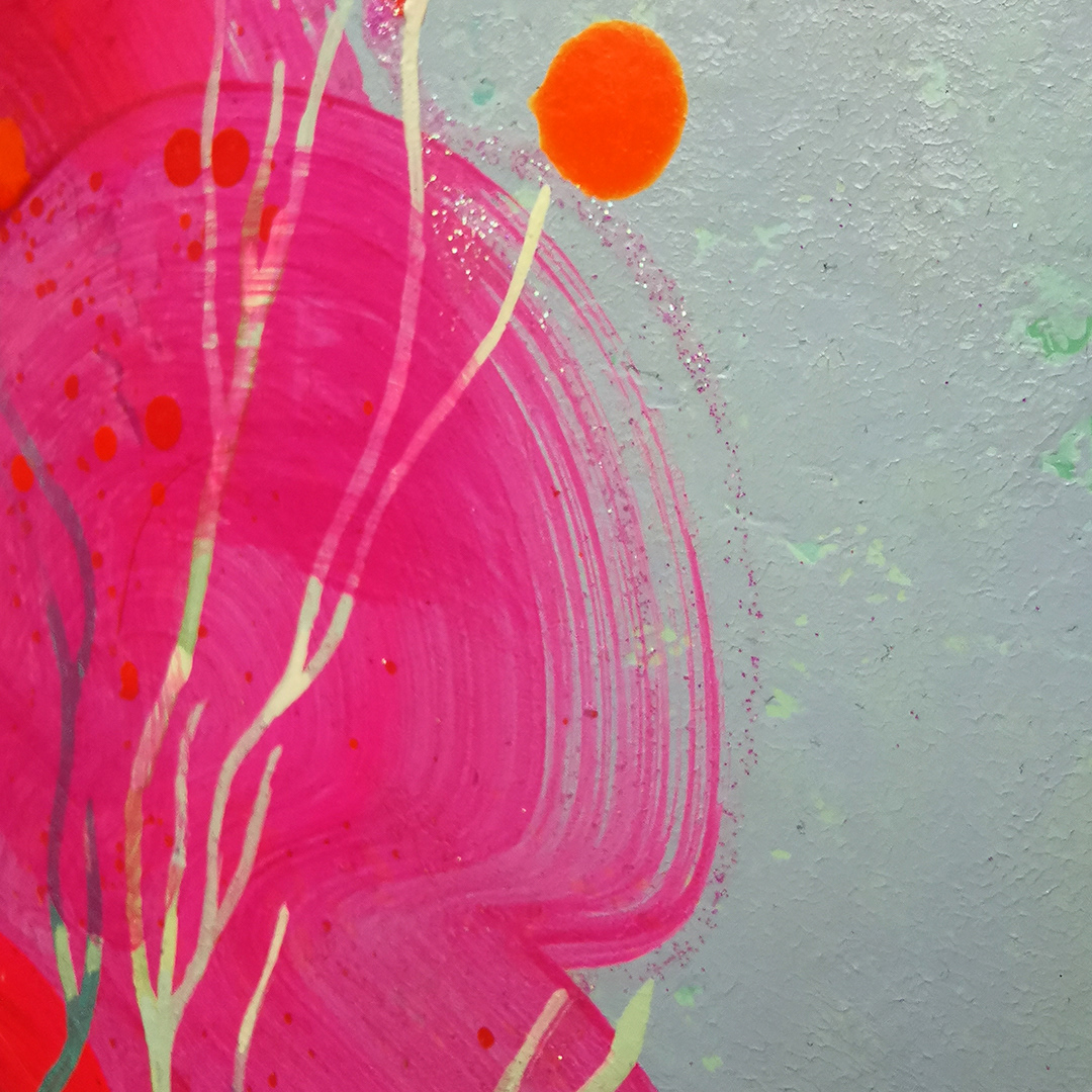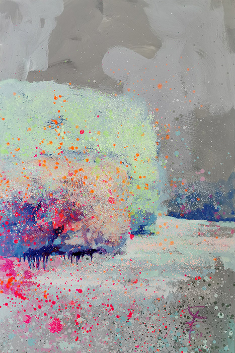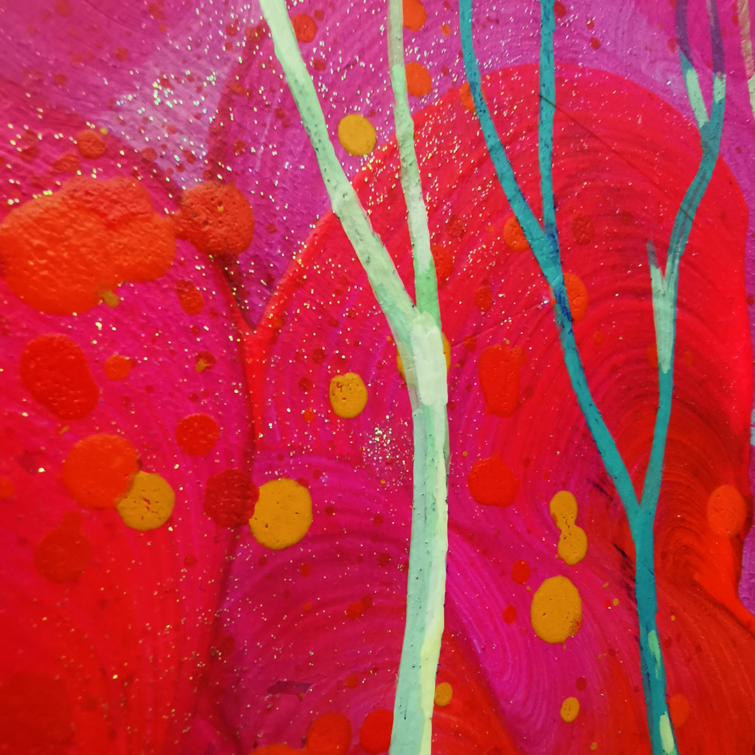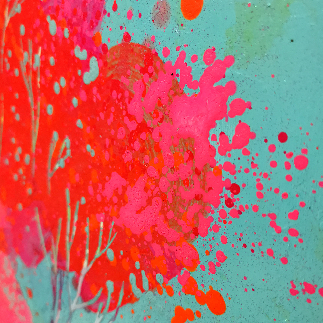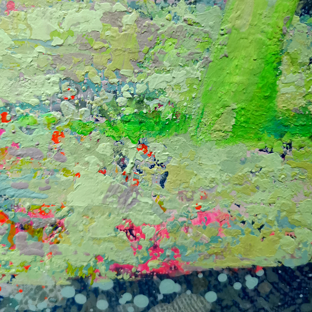 Większość prac ma elementy farby fluorescencyjnej, metalicznej, na niektórych jest brokat, co czyni prace zmienne w zależności od oświetlenia, nawiązując tym samym do zmienności prawdziwych pejzaży. Zderzenie form, kształtów, sugestii, daje za to ogromną przestrzeń do interpretacji i tym samym procesu współtworzenia dla widza.