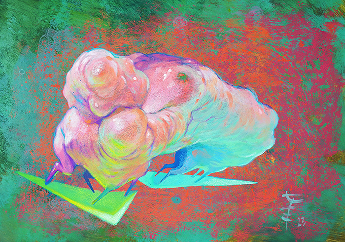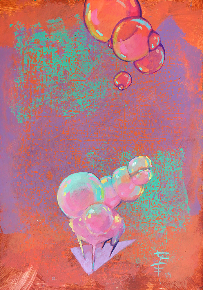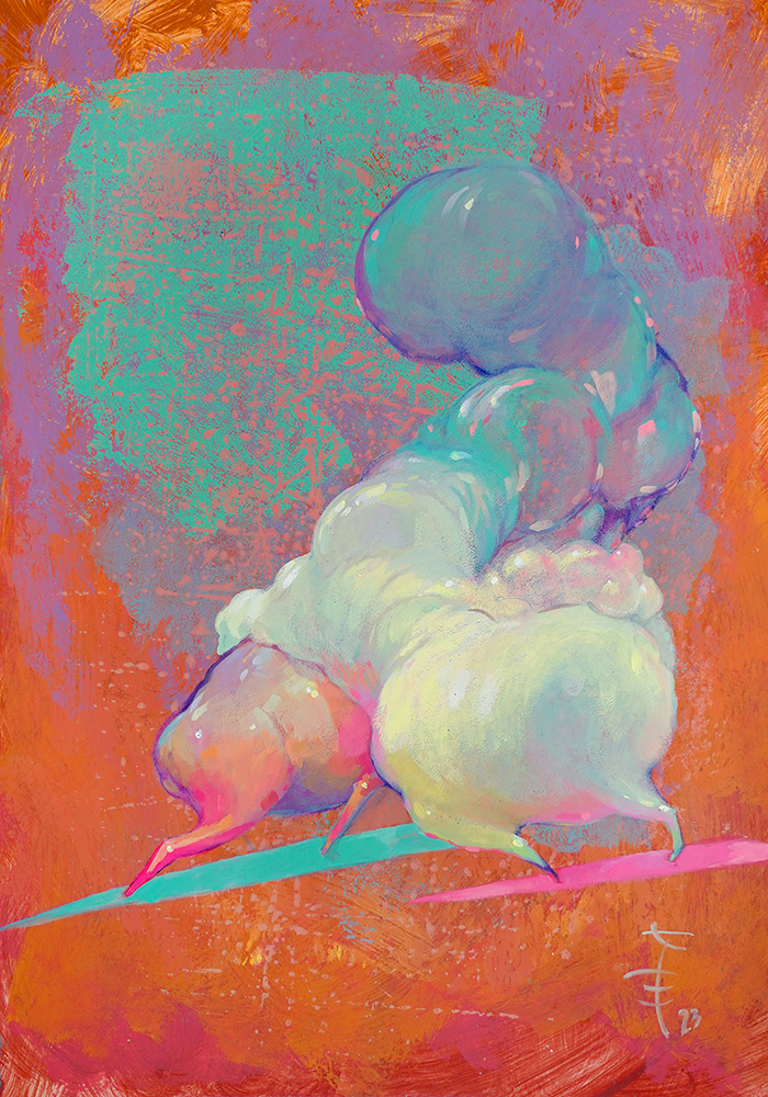 Postrzegam je jako ulotne, dzikie istoty, pozbawione swojej ostatecznej formy, efemeryczne i iluzoryczne. Są jak bańki, spuchnięte, nabrzmiałe, napełnione napięciem. Te bezkształtne stwory pulsują nieustannie, jak zderzacze światów.