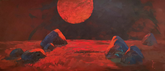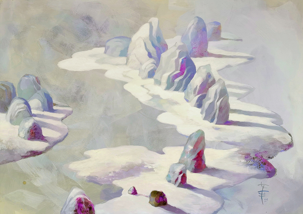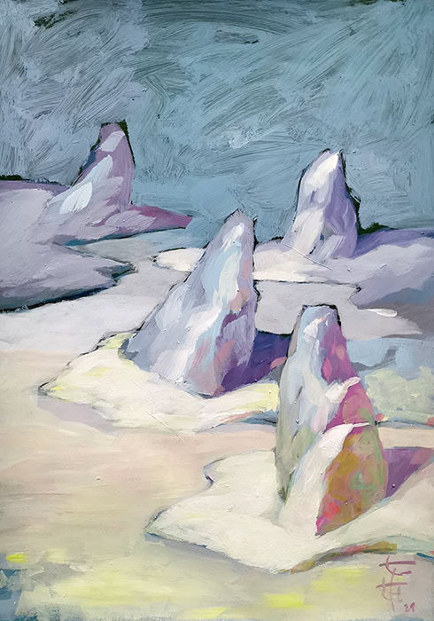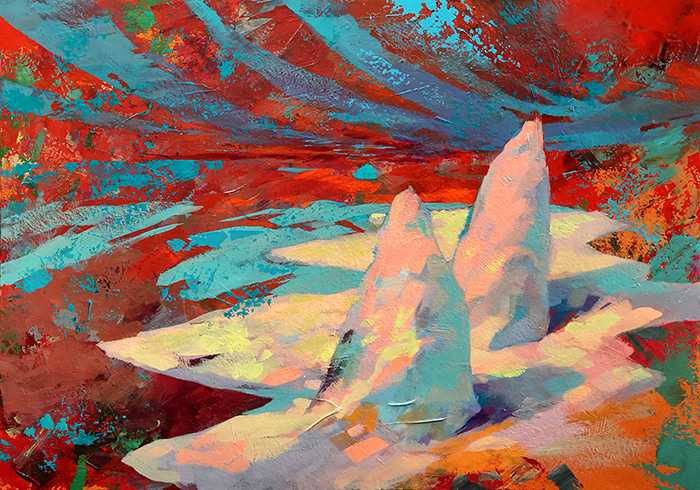Większość prac ma elementy farby fluorescencyjnej, metalicznej, na niektórych jest brokat, co czyni prace zmienne w zależności od oświetlenia, nawiązując tym samym do zmienności prawdziwych pejzaży. Zderzenie form, kształtów, sugestii, daje za to ogromną przestrzeń do interpretacji i tym samym procesu współtworzenia dla widza.